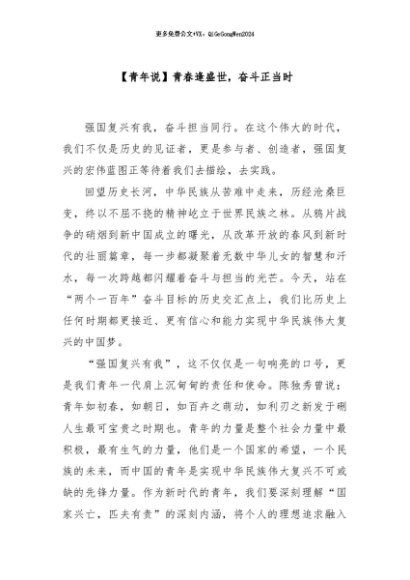 / 【七哥公文】2024年:【青年说】青春逢盛世,奋斗正当时+更多免费公文+VX:QiGeGongWen2024