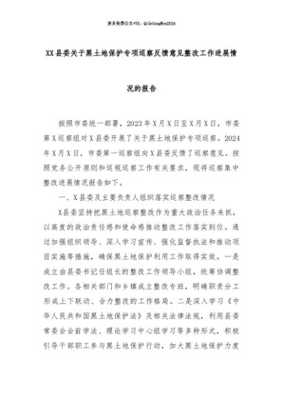 【七哥公文】2024年:XX县委关于黑土地保护专项巡察反馈意见整改工作进展情况的报告+更多免费公文+VX:QiGeGongWen2024