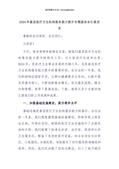 【七哥公文】2024年:2024年基层医疗卫生机构服务能力提升专题座谈会汇报发言+更多免费公文+VX:QiGeGongWen2024
