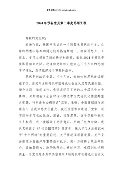 / 【七哥公文】2024年:2024年预备党员第三季度思想汇报+更多免费公文+VX:QiGeGongWen2024