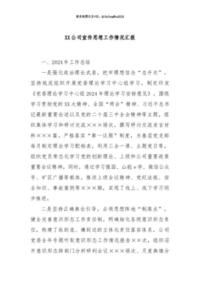 / 【七哥公文】2024年:XX公司宣传思想工作情况汇报+更多免费公文+VX:QiGeGongWen2024