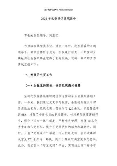 / 【七哥公文】2024年:2024年党委书记述职报告+更多免费公文+VX:QiGeGongWen2024