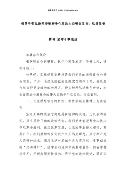 【七哥公文】2024年:领导干部弘扬延安精神净化政治生态研讨发言:弘扬延安精神 坚守干事底线+更多免费公文+VX:QiGeGongWen2024