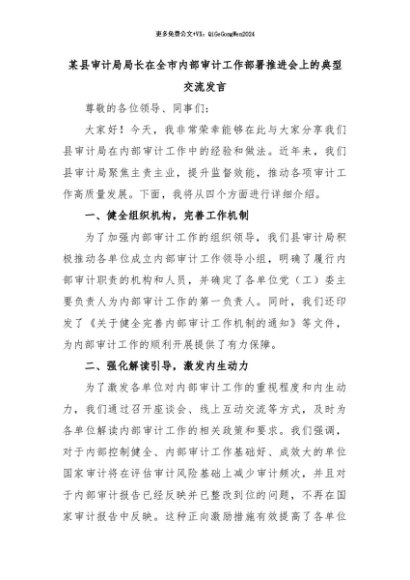 【七哥公文】2024年:某县审计局局长在全市内部审计工作部署推进会上的典型交流发言+更多免费公文+VX:QiGeGongWen2024