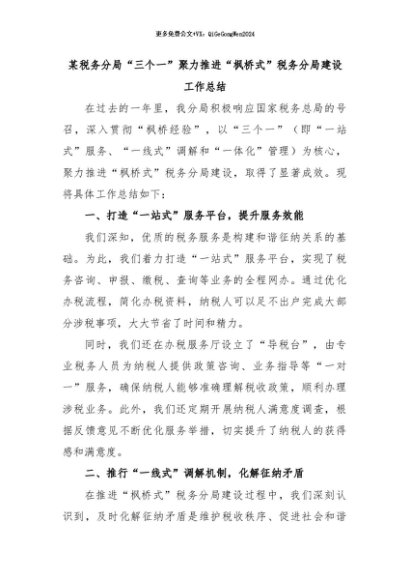 【七哥公文】2024年:某税务分局“三个一”聚力推进“枫桥式”税务分局建设工作总结+更多免费公文+VX:QiGeGongWen2024