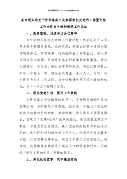 【七哥公文】2024年:某市税务局关于贯彻落实中央和国家机关党的工作暨纪检工作会议有关精神情况工作总结+更多免费公文+VX:QiGeGongWen2024