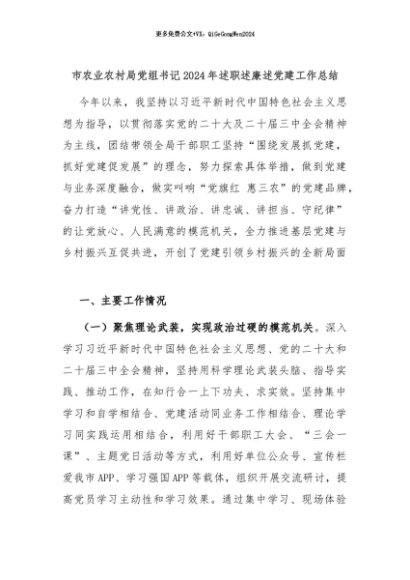【七哥公文】2024年:市农业农村局党组书记2024年述职述廉述党建工作总结+更多免费公文+VX:QiGeGongWen2024