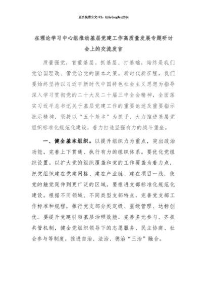 【七哥公文】2024年:在理论学习中心组推动基层党建工作高质量发展专题研讨会上的交流发言+更多免费公文+VX:QiGeGongWen2024