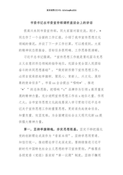 / 【七哥公文】2024年:市委书记在市委宣传部调研座谈会上的讲话+更多免费公文+VX:QiGeGongWen2024