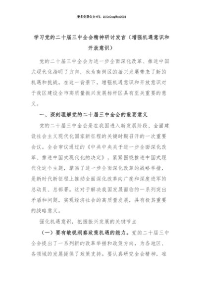 【七哥公文】2024年:学习党的二十届三中全会精神研讨发言(增强机遇意识和开放意识)+更多免费公文+VX:QiGeGongWen2024