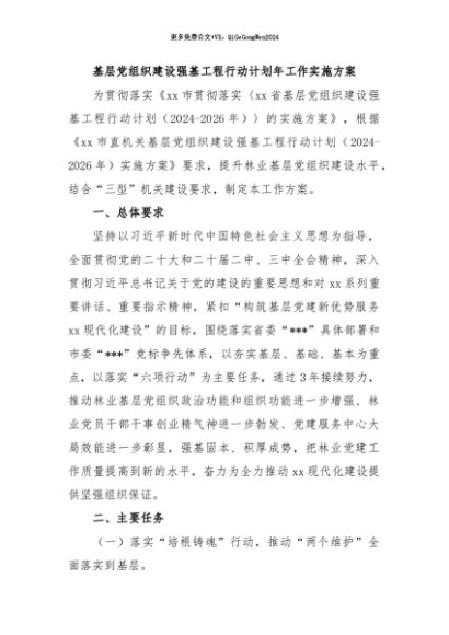 / 【七哥公文】2024年:基层党组织建设强基工程行动计划年工作实施方案+更多免费公文+VX:QiGeGongWen2024