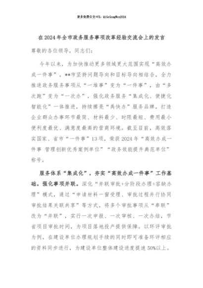 【七哥公文】2024年:在2024年全市政务服务事项改革经验交流会上的发言+更多免费公文+VX:QiGeGongWen2024
