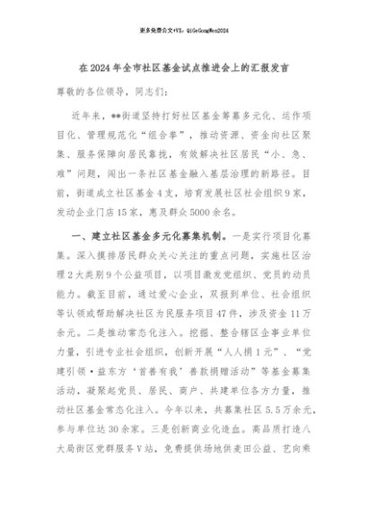 / 【七哥公文】2024年:在2024年全市社区基金试点推进会上的汇报发言+更多免费公文+VX:QiGeGongWen2024
