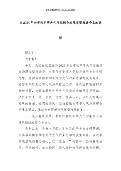 【七哥公文】2024年:在2024年全市秋冬季大气污染综合治理攻坚推进会上的讲话+更多免费公文+VX:QiGeGongWen2024