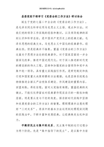 / 【七哥公文】2024年:县委党校干部学习《党委会的工作方法》研讨体会+更多免费公文+VX:QiGeGongWen2024