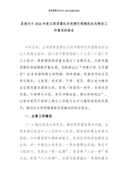 【七哥公文】2024年:县委关于2024年度以高质量机关党建引领模范机关建设工作情况的报告+更多免费公文+VX:QiGeGongWen2024