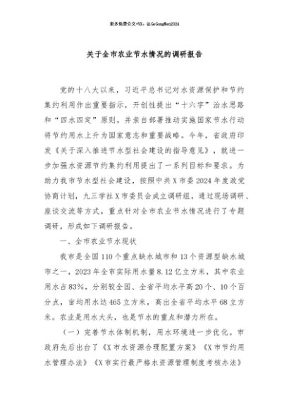 / 【七哥公文】2024年:关于全市农业节水情况的调研报告+更多免费公文+VX:QiGeGongWen2024