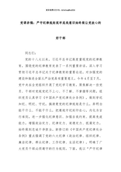 【七哥公文】2024年:党课讲稿:严守纪律规矩筑牢底线意识始终做让党放心的好干部+更多免费公文+VX:QiGeGongWen2024