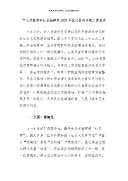 【七哥公文】2024年:市人力资源和社会保障局2024年优化营商环境工作总结+更多免费公文+VX:QiGeGongWen2024