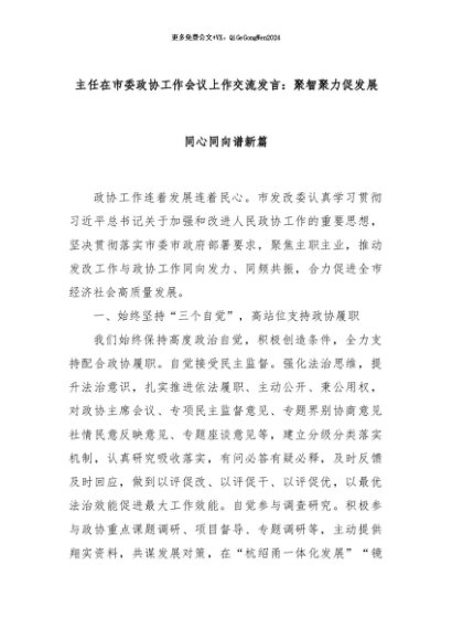 【七哥公文】2024年:主任在市委政协工作会议上作交流发言:聚智聚力促发展同心同向谱新篇+更多免费公文+VX:QiGeGongWen2024
