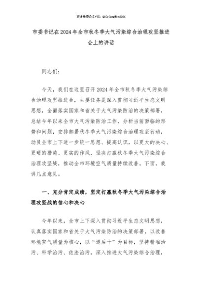 【七哥公文】2024年:市委书记在2024年全市秋冬季大气污染综合治理攻坚推进会上的讲话+更多免费公文+VX:QiGeGongWen2024