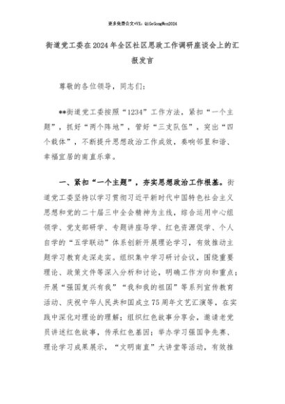 【七哥公文】2024年:街道党工委在2024年全区社区思政工作调研座谈会上的汇报发言+更多免费公文+VX:QiGeGongWen2024