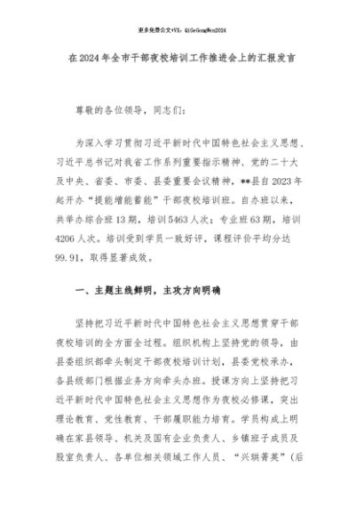 【七哥公文】2024年:在2024年全市干部夜校培训工作推进会上的汇报发言+更多免费公文+VX:QiGeGongWen2024