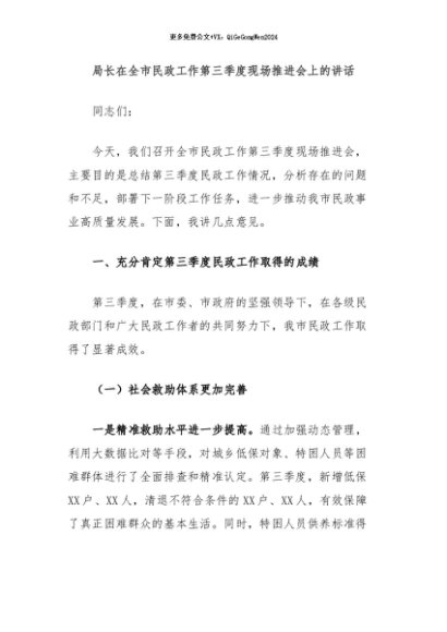 / 【七哥公文】2024年:局长在全市民政工作第三季度现场推进会上的讲话+更多免费公文+VX:QiGeGongWen2024