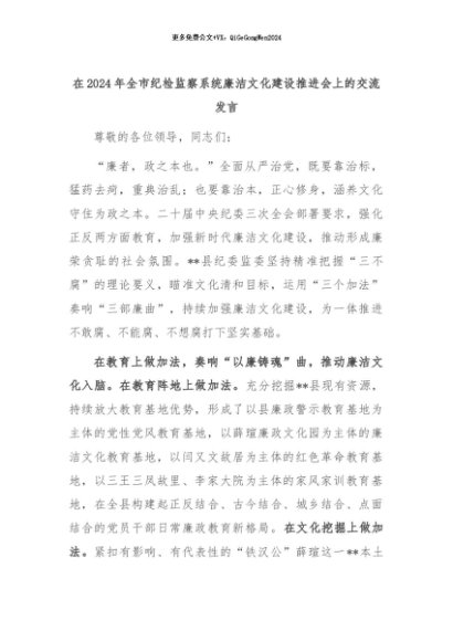 【七哥公文】2024年:在2024年全市纪检监察系统廉洁文化建设推进会上的交流发言+更多免费公文+VX:QiGeGongWen2024