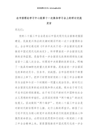 【七哥公文】2024年:在市委理论学习中心组第十一次集体学习会上的研讨交流发言+更多免费公文+VX:QiGeGongWen2024