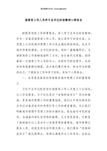 / 【七哥公文】2024年:城管局工作人员学习总书记回信精神心得体会+更多免费公文+VX:QiGeGongWen2024