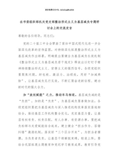 【七哥公文】2024年:在市委组织部机关党支部整治形式主义为基层减负专题研讨会上的交流发言+更多免费公文+VX:QiGeGongWen2024