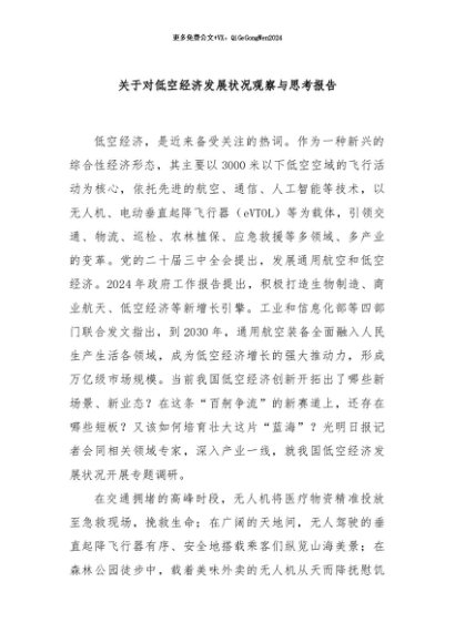 / 【七哥公文】2024年:关于对低空经济发展状况观察与思考报告+更多免费公文+VX:QiGeGongWen2024