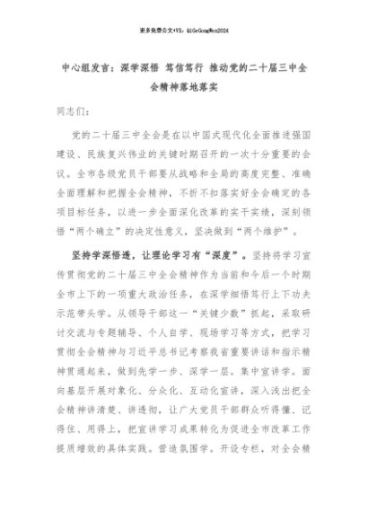 【七哥公文】2024年:中心组发言:深学深悟 笃信笃行 推动党的二十届三中全会精神落地落实+更多免费公文+VX:QiGeGongWen2024