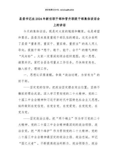 【七哥公文】2024年:县委书记在2024年新任职干部和晋升职级干部集体谈话会上的讲话+更多免费公文+VX:QiGeGongWen2024