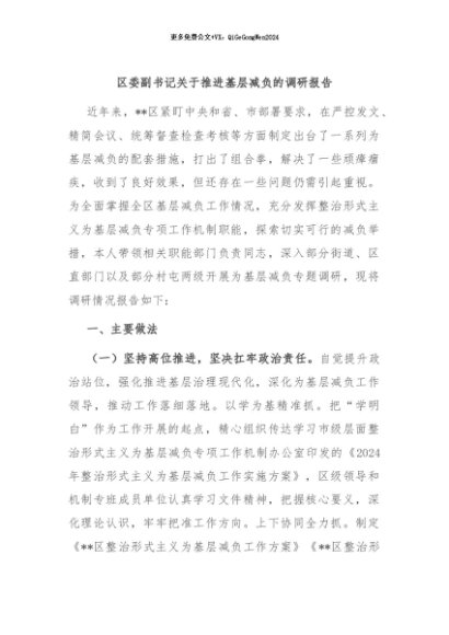 / 【七哥公文】2024年:区委副书记关于推进基层减负的调研报告+更多免费公文+VX:QiGeGongWen2024