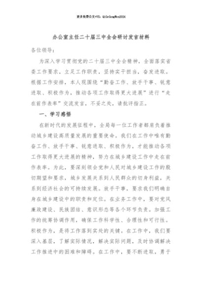/ 【七哥公文】2024年:办公室主任二十届三中全会研讨发言材料+更多免费公文+VX:QiGeGongWen2024