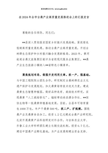 【七哥公文】2024年:在2024年全市古桑产业高质量发展推进会上的汇报发言+更多免费公文+VX:QiGeGongWen2024