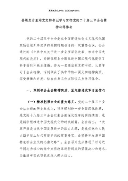 【七哥公文】2024年:县煤炭计量站党支部书记学习贯彻党的二十届三中全会精神心得体会+更多免费公文+VX:QiGeGongWen2024