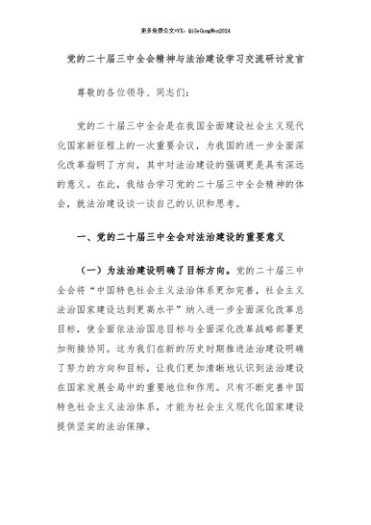 / 【七哥公文】2024年:党的二十届三中全会精神与法治建设学习交流研讨发言+更多免费公文+VX:QiGeGongWen2024