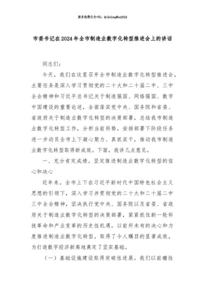 【七哥公文】2024年:市委书记在2024年全市制造业数字化转型推进会上的讲话+更多免费公文+VX:QiGeGongWen2024