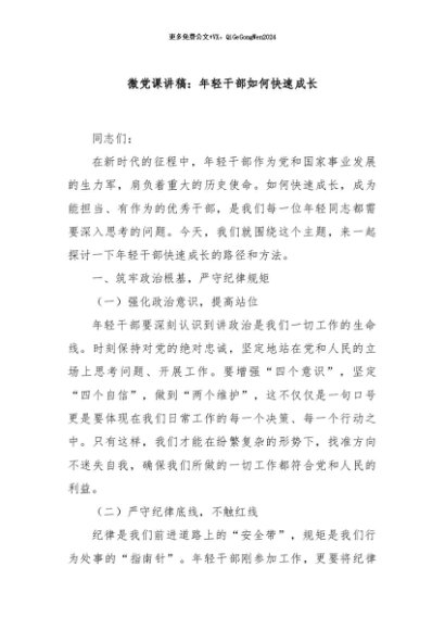 / 【七哥公文】2024年:微党课讲稿:年轻干部如何快速成长+更多免费公文+VX:QiGeGongWen2024