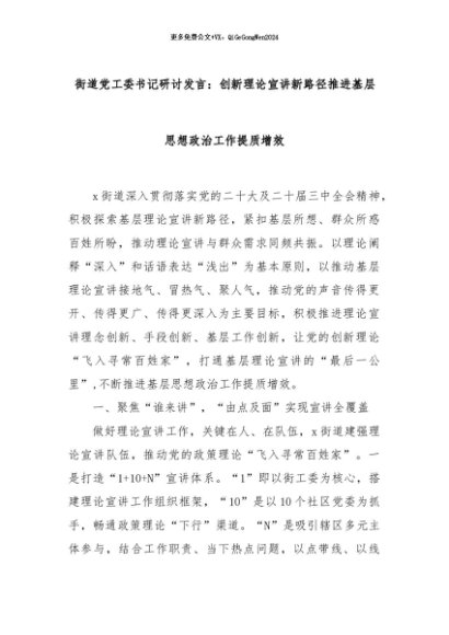 【七哥公文】2024年:街道党工委书记研讨发言:创新理论宣讲新路径推进基层思想政治工作提质增效+更多免费公文+VX:QiGeGongWen2024