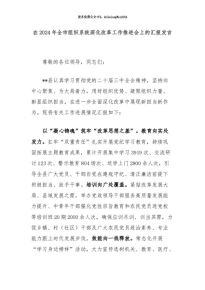【七哥公文】2024年:在2024年全市组织系统深化改革工作推进会上的汇报发言+更多免费公文+VX:QiGeGongWen2024