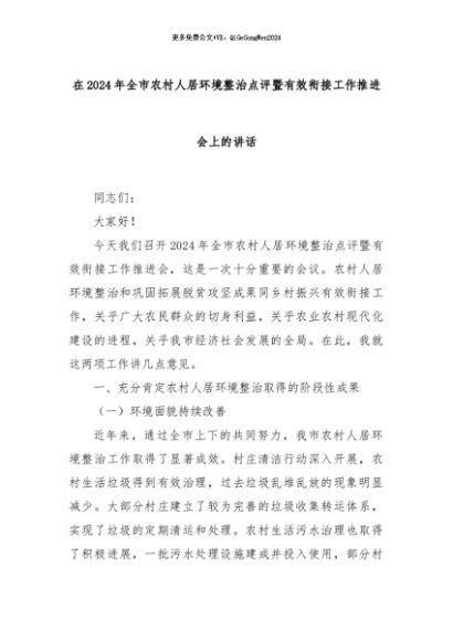 【七哥公文】2024年:在2024年全市农村人居环境整治点评暨有效衔接工作推进会上的讲话+更多免费公文+VX:QiGeGongWen2024