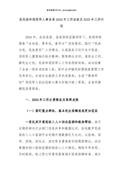 【七哥公文】2024年:县民政和退役军人事务局2024年工作总结及2025年工作计划+更多免费公文+VX:QiGeGongWen2024
