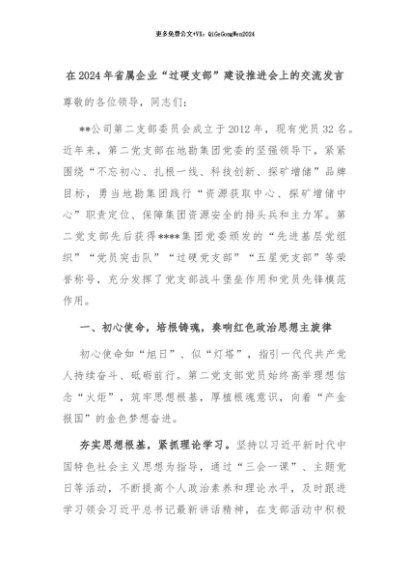 【七哥公文】2024年:在2024年省属企业“过硬支部”建设推进会上的交流发言+更多免费公文+VX:QiGeGongWen2024