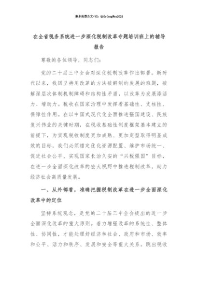 【七哥公文】2024年:在全省税务系统进一步深化税制改革专题培训班上的辅导报告+更多免费公文+VX:QiGeGongWen2024