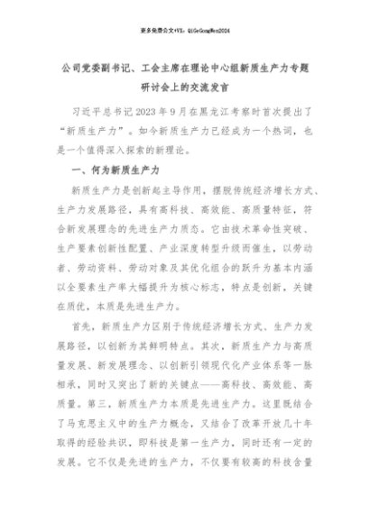 【七哥公文】2024年:公司党委副书记、工会主席在理论中心组新质生产力专题研讨会上的交流发言+更多免费公文+VX:QiGeGongWen2024