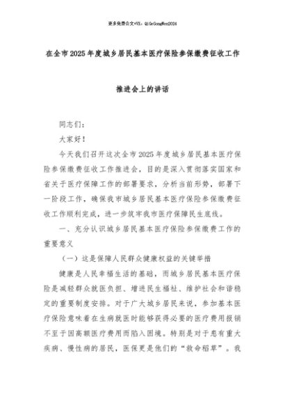 【七哥公文】2024年:在全市2025年度城乡居民基本医疗保险参保缴费征收工作推进会上的讲话+更多免费公文+VX:QiGeGongWen2024